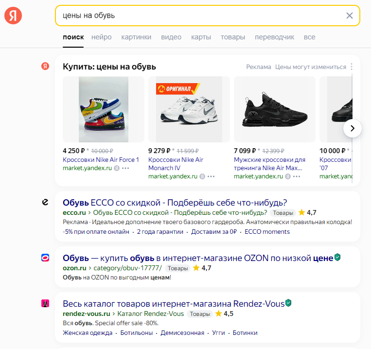 Рассмотрим для примера фразу «цены на обувь». Среди первых результатов поиска в Яндексе видим заметный рекламный блок, ссылки на два известных интернет-магазина и маркетплейс Ozon. Это однозначно коммерческий запрос.
