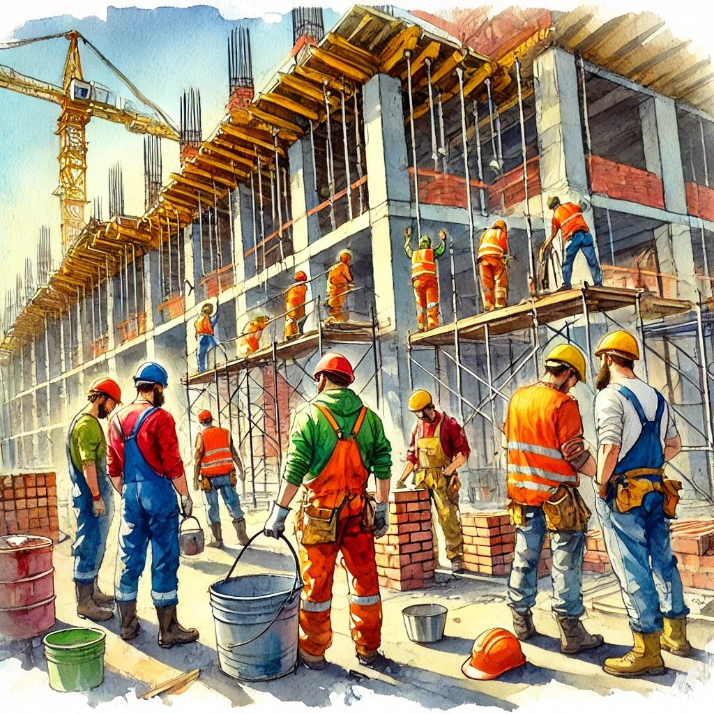 - Разными ролями (каменщики, штукатуры, маляры, электрики и др.);