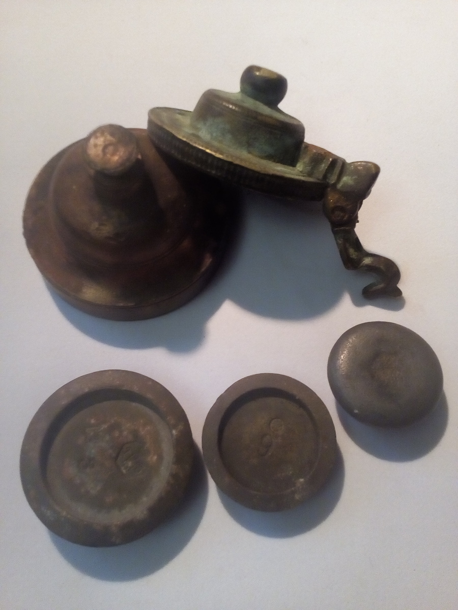 Складной русский фунт. Купить можно, но мне - дорого. У меня есть комплаектующие. И две девектные крышки. На две крышки - один замочек. :0(( И еще вот такая гирька имеется... Пол фунта. С 1899 года один пуд равен 16,3805 кг. Фунт = 1/40 пуда