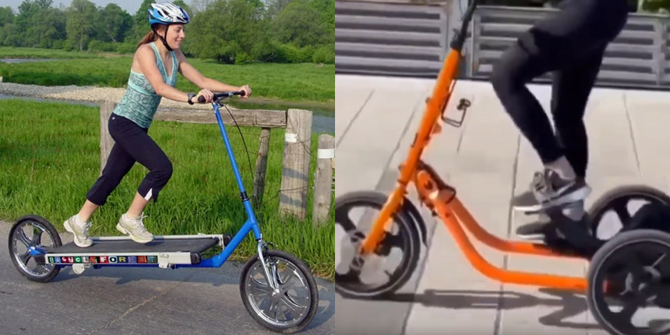 Не все изобретения одинаково полезны. Но те чья польза сомнительна, могут быть по-своему интересны. Потому вперёд, в прошлое. Простой самокат (даже без электромотора) увеличивает скорость человека в сравнении с ходьбой. Гениально простое и эффективное средство транспорта. Что тут можно поменять? Изобретатели придумали несколько вариантов самокатов, на которых для разгона нужно не от земли отталкиваться, а… ходить. Это самокаты с беговой дорожкой и с качающимися педалями. Прикладываете к этим деталям усилие, вращаются колёса и вперёд. Однако, это всё современные чудеса, созданные в наше время. А вот в Лос-Анджелесе в 1934 году некий изобретатель представил штуковину, переворачивающую всю эту логику с ног на голову. Здесь человек сидит в седле, крутит педали, как у велосипеда, чтобы приводить в движение механические ноги и шагать! Насколько это быстрее и удобнее, чем просто ходить, а тем более пользоваться обычным велосипедом, история умалчивает. Вспомним заодно, что слово “велосипед” бы