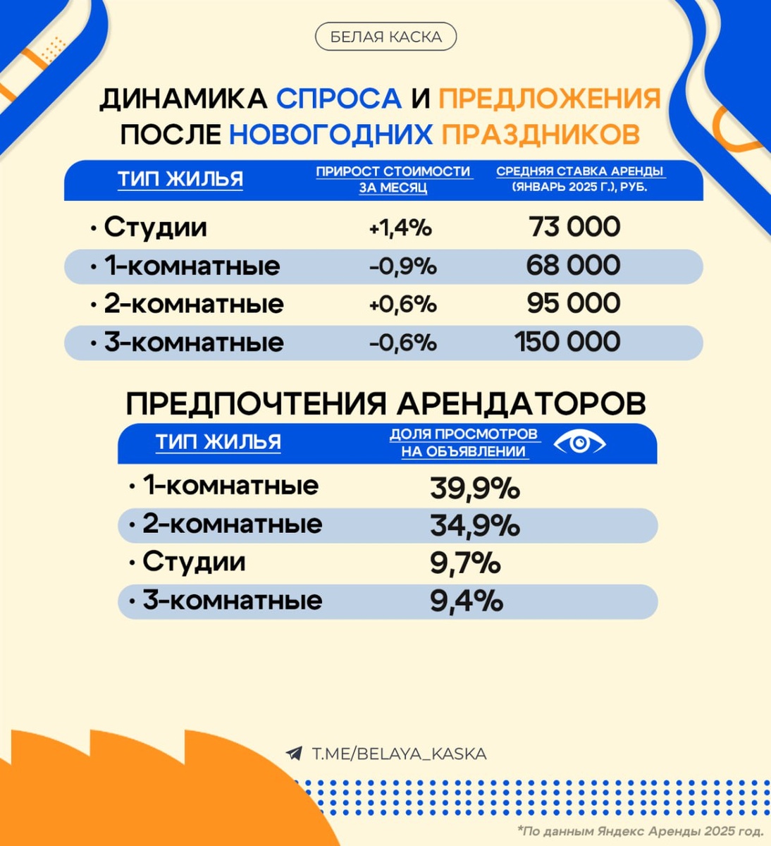 После сезонного спада на рынке аренды жилья в Москве снова активность. • Число просмотров объявлений: +12,3% • Количество сдаваемых квартир: +9,2% • Рост спроса в городах-миллионниках: +17,8% Арендаторы возвращаются к поиску квартир, а владельцы вновь выставляют жильё после праздников.