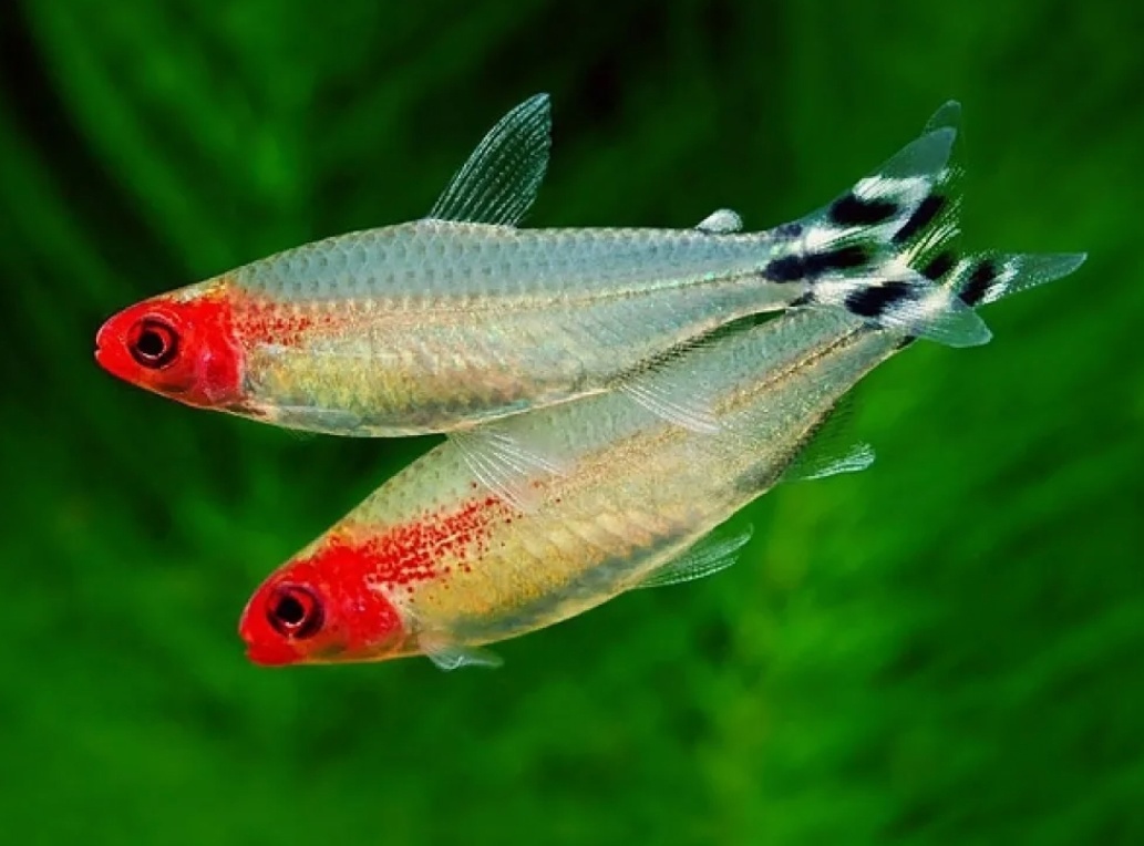 Родостомусы образуют стаи и питаются различными насекомыми и их личинками. Их тело вытянутое и стройное, они могут достигать длины до 4,5 см и жить около 5 лет. Основной окрас тела родостомусов серебристый с неоновым отливом. Их самая выдающаяся характеристика - яркое красное пятно на голове, за которое они и получили название "красноносая тетра".