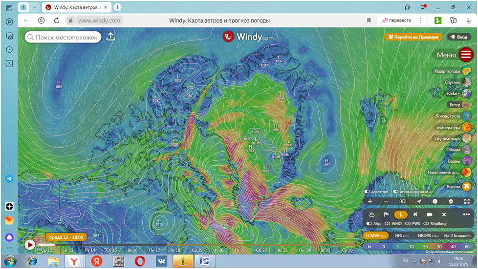 Удар по голове, или как искусственное создание циклонов для защиты США от арктического вторжения создаёт зоны сверхвысокого давления в России. Создавая циклоны с помощью рентгеновских лазеров с термоядерной накачкой или электронных пушек, США увидели, что природа в отместку создаёт антициклоны с очень большим давлением, и управлять климатом трудно и затратно. Создав у берегов Гренландии несколько искусственных циклонов, США не смогло предотвратить очередное арктическое вторжение, наверное, похоже, что в атмосфере в верхних слоях уже больше не хватает влаги для конденсации. Поэтому рядом с искусственными циклонами вырастают антициклоны, лавины конденсации больше не возникает. Циклоны на космоснимках отмечены зонами низкого давления с буквой «L» - low , антициклоны буквой «Н» - high. На космоснимке Виндиком внизу видно, что для образования циклона США создали опять тоже число – 11 торнадо над Гренландией, надеясь превратить их в циклон, подобный тому, что сейчас находится восточнее