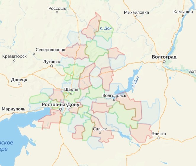 Наконец-то нашел онлайн-карту районов Ростовской области. Правда, без городских округов, но все равно очень удобно.
