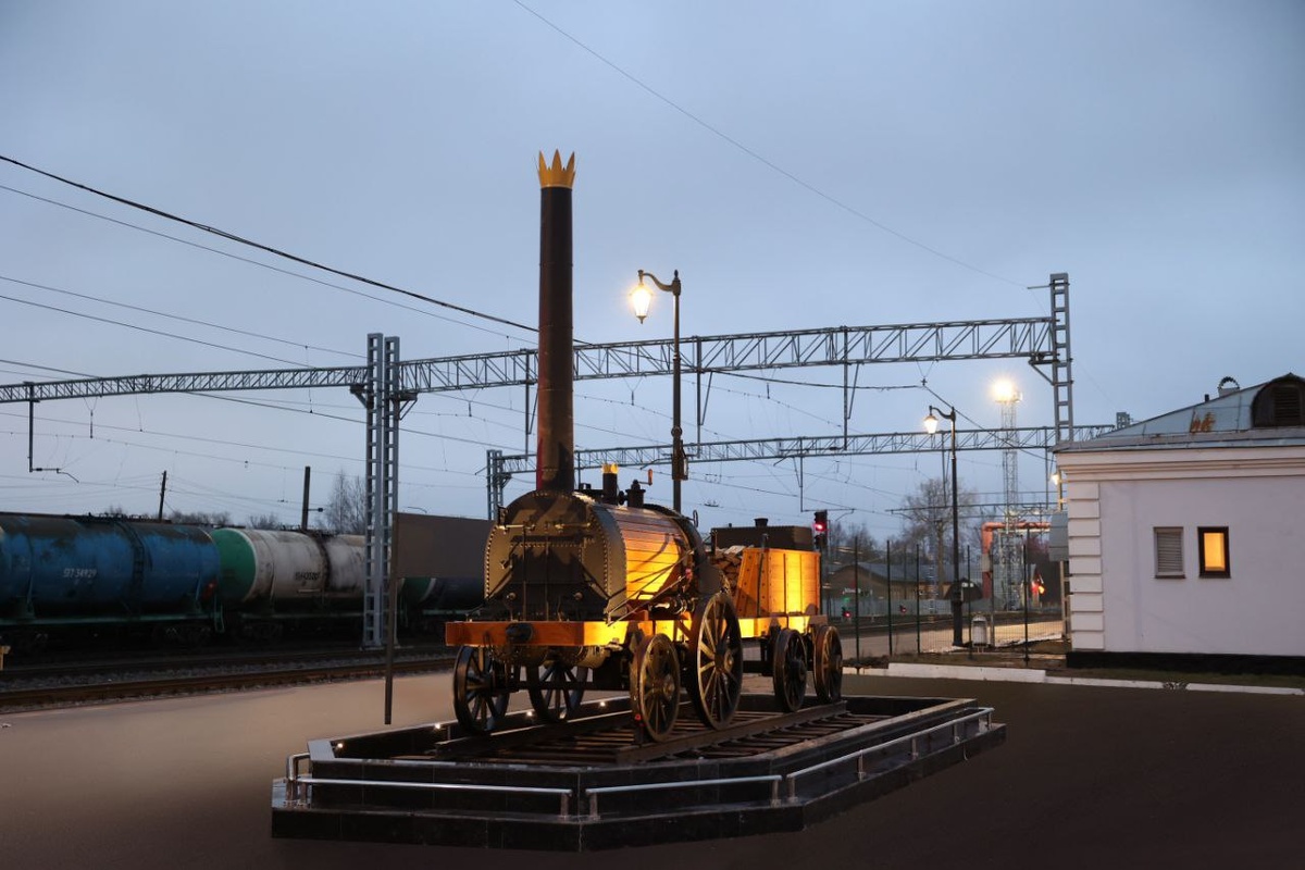 Модель паровоза Черепановых выполнили из аутентичных материалов в натуральную величину. Фото: Северная железная дорога. Первый российский паровоз был создан на Урале изобретателями отцом и сыном Ефимом и Мироном Черепановыми в 1834 году. Это вторая созданная в мире подобная машина, она имела вес 3,3 т, мощность 30 л.с., максимальную скорость 15 км/ч. Памятник видно со стороны перрона и города. В вечернее время включается подсветка. Фото: Северная железная дорога. Черепановы были авторами множества технических нововведений на уральских заводах. Бывшие крепостные получили вольные грамоты благодаря своему таланту.