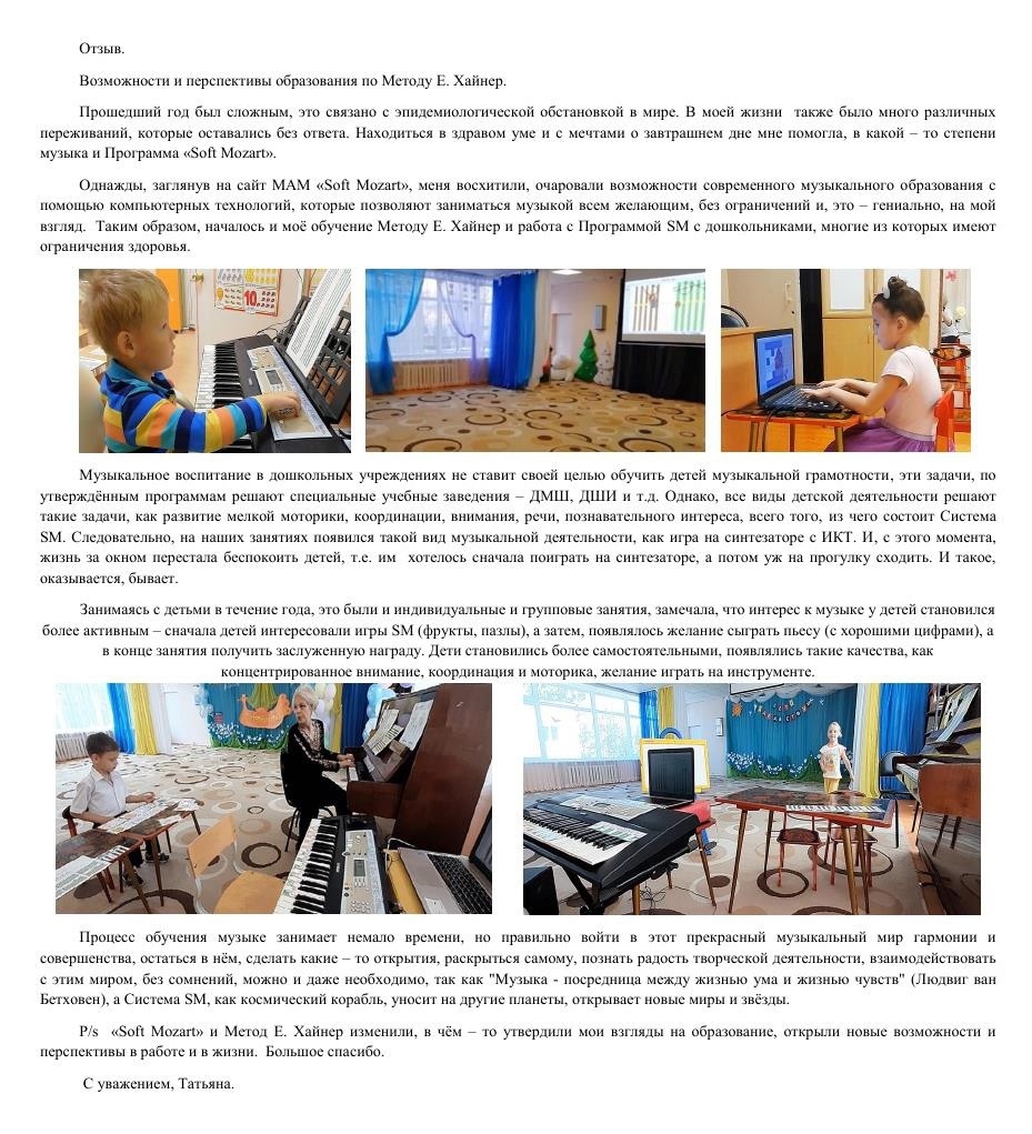 В это сложное время находится в здравом уме и с мечтами о завтрашнем дне мне в какой-то степени помогла музыка и программа Софт Моцарт. Однажды заглянув на сайт международной Академии Софт Моцарт меня восхитили, очаровали возможности современного музыкального образования с помощью компьютерных технологий, которые позволяют заниматься музыкой со всеми желающими без ограничений и, это - гениально, на мой взгляд. Таким образом началось моё обучение по методу Хайнер и работа с программой Софт Моцарт с дошкольниками, многие из которых имеют ограничения здоровья. Музыкальное воспитание с дошкольных учреждениях не ставит своей целью обучить музыкальной грамотности. Эти задачи по утверждённым программам решают специальные учебные заведения - ДМШ, ДШИ и др. Однако все виде детской деятельности решают такие задачи, как развитие мелкой моторики, координации, речи, познавательного интереса, всего того, из чего состоит система Софт Моцарт. Следовательно, на наших занятиях появился такой вид музыкал