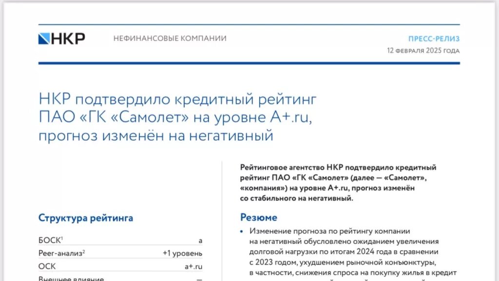 Рейтинговое агентство НКР изменило прогноз кредитного рейтинга «Самолета» со стабильного на негативный