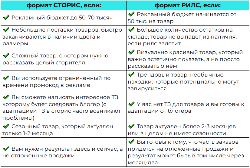 Всем привет! Меня зовут Лада, я более 2 лет специализируюсь на закупке внешней рекламы для селлеров. В этой статье рассмотрим основные отличия рекламы у блогеров в рилс и в сторис и разберёмся, что лучше для товаров на WB / OZON. Мой тг для связи: @ladaeg (https://t.me/ladaeg) Время прочтения: 6 минут Основное отличие — это сам формат рекламы. В сторис мы даём рекомендацию товара на 3-5 сторис, где блогер, начиная с подводки, плавно переходит к обзору и даёт ссылки на товар. При хорошем ТЗ в сторис можно сделать отличную нативную рекламу. В рилс особо нет времени для раскачки, поэтому здесь чаще встречается прямая реклама. В рилс нужно быстро и ритмично рассказать только самое главное. Подробнее поговорим про ссылки на товар. В сторис мы можем оставлять прямые ссылки или диплинки на ВБ / Озон, а затем точно отследить количество пользователей, перешедших в карточку товара. В рилс мы можем лишь оставить артикул товара в описании, так как ссылки здесь не работают. Для некоторых это принц