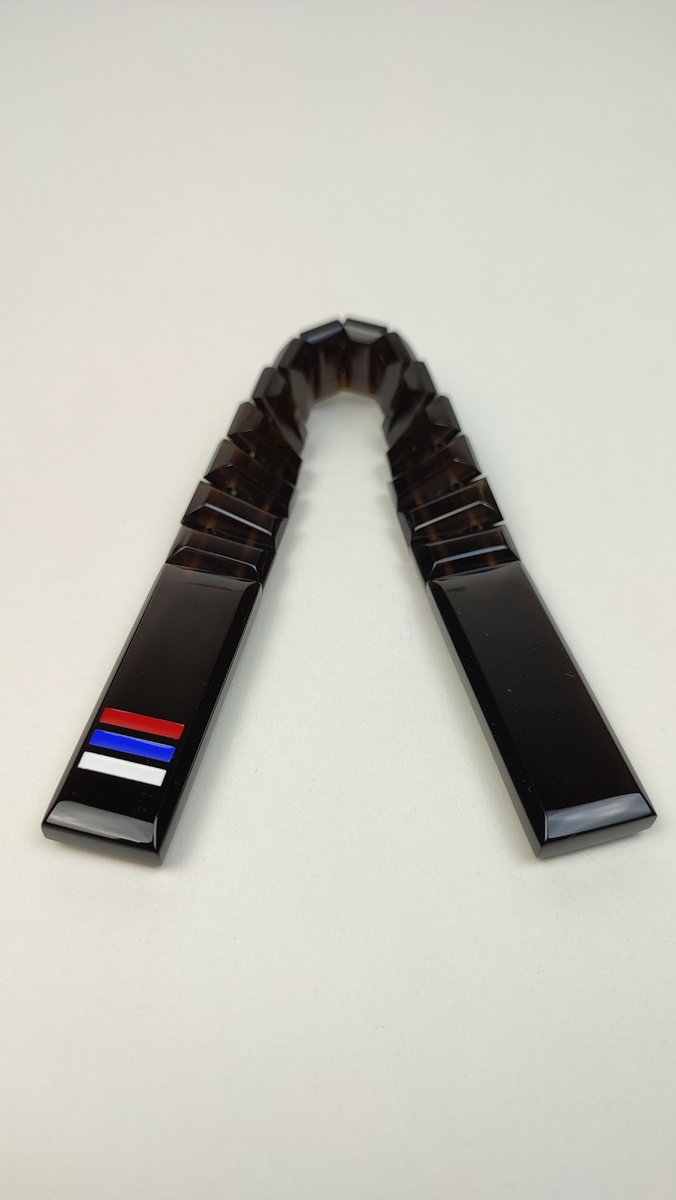 толщина ~ 7−8 мм. Гравировка нанесена на две поверхности из четырёх, содержит в себе один эскиз Чёрная база, строгая и лаконичная, словно безмолвная сила, уверенно идущая вперёд. Акцентный триколор на конечниках — символ гордости, преемственности и преданности своим корням. Эти перекидные четки — не просто аксессуар, а отражение характера. Спокойная уверенность в каждом движении. Для тех, кто ценит традиции, но идёт своим путём. Как вам такой дизайн?