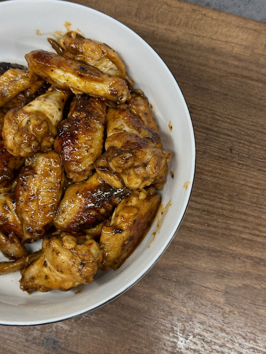 Закуска под пиво - огонь! Берём: крылья (разрезаем на 3 части, кончики убираем) Маринуем в чаше: крылья + соевый соус 2 ст.л. + масло растительное 1 ст.л. + чеснок 1-2 зубчика мелко рубим + перчик чили (по желанию, до остроты) + соль/перец/травы/специи - и оставляем постоять минут 15. Выкладываем на сковородку и хорошо поджариваем с 2-х сторон до корочки золотой, добавляем в сковороду к крыльям 1 ст.л с горкой мёда + 2 ст.л соевого соуса + соус баффало (хайнс, можно взять в какой-нибудь пятёрке) и глазируем до готовности, пока соус полностью «прилипнет» к крылышкам. Готово! Выкладываем на тарелку и посыпаем по желанию кунжутом Приятного аппетита! 🤎
