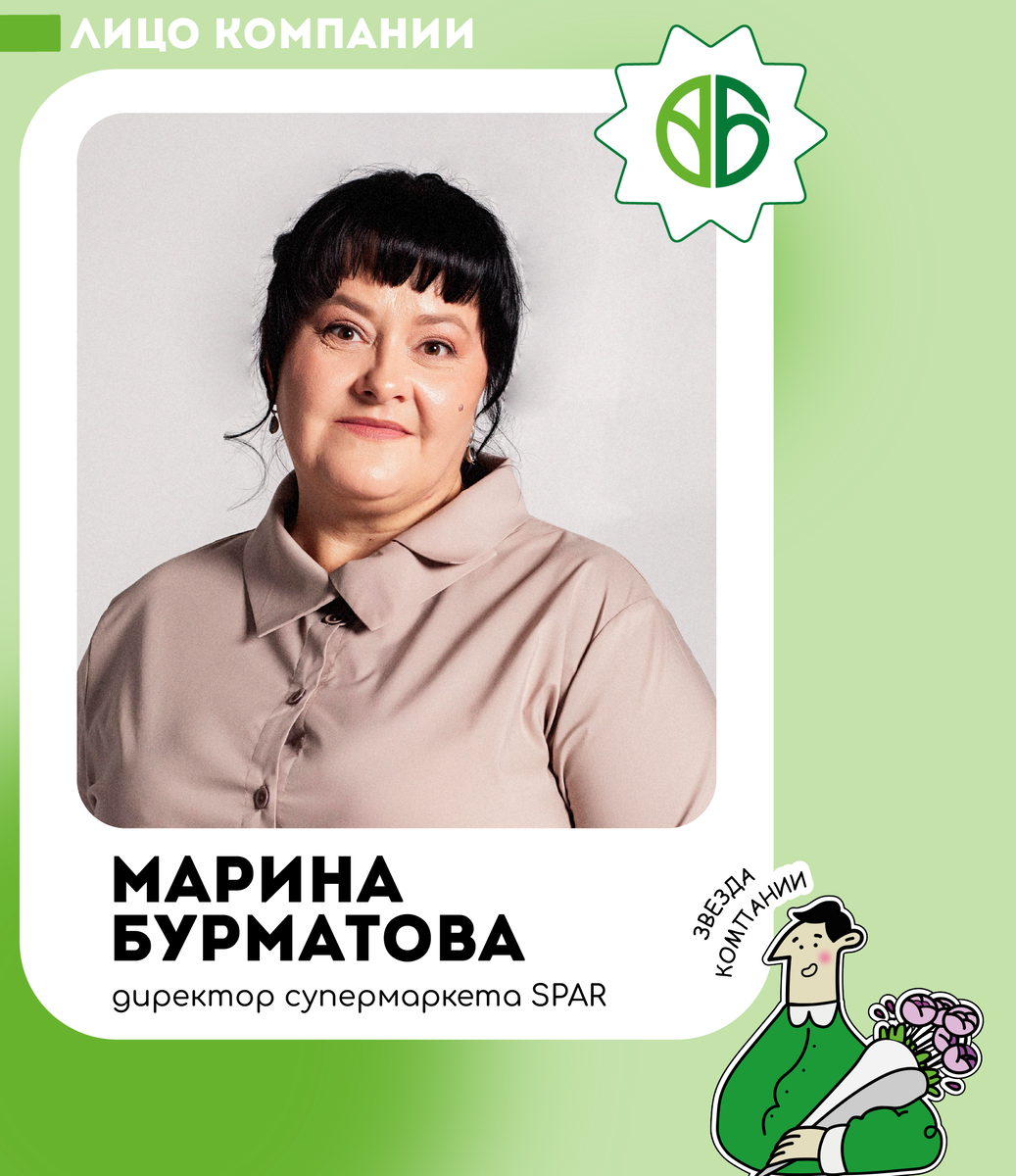 Марина Бурматова — невероятная личность, которая стала настоящим примером для подражания. С момента своего прихода в компанию «ЛАМА» она зарекомендовала себя как ответственный и целеустремлённый сотрудник. Достижения Марины Бурматовой говорят сами за себя: она проявляет лидерские качества и стремится к совершенству. Она пришла в компанию в 2005 году на должность продавца в отделе гастрономии. Благодаря своему трудолюбию Марина быстро начала продвигаться по карьерной лестнице и стала старшим продавцом. Со временем ее усилия были вознаграждены, и она заняла должность заместителя директора, а затем директора супермаркета SPAR (ул. Солнечная, 2/5, г. Северск). – Я горда тем, что являюсь сотрудником нашей компании. «ЛАМА» хорошо известна своим непревзойденным уровнем профессионализма и возможностями роста. С момента, когда я начала свой путь здесь, я приобрела ценный опыт, который только укрепил моё чувство принадлежности к компании. Я занимаюсь тем, что мне действительно нравится, и это пр