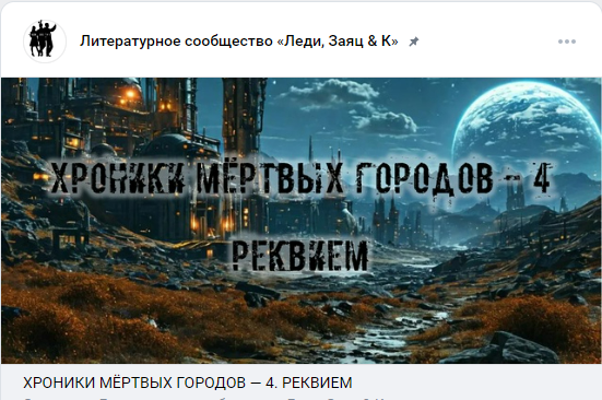 Друзья! Внемля многочисленным мольбам, сообщество «Леди, Заяц & К» — объявляет старт литературного конкурса «ХРОНИКИ МЁРТВЫХ ГОРОДОВ — 4. РЕКВИЕМ». Условия конкурса прописаны в статье. Судя по порядковому номеру, это уже не