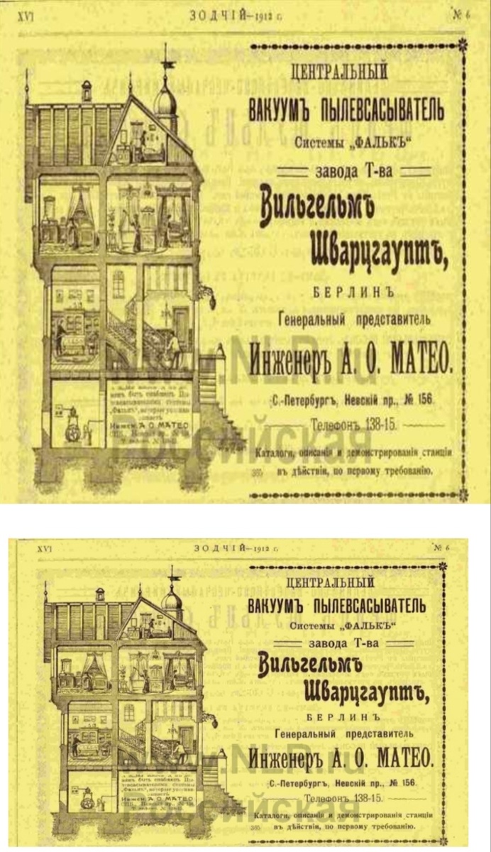 Первые системы центрального пылеудаления говорят появились в 1905 году в Эссене и в 1908 году в Гамбурге в односемейных коттеджах. Говорят, что в 1912 году в России, в Санкт-Петербурге, также использовались такие системы, говорят системы были и в Москве. Всё это говорят, были большие (по тем меркам), прогрессивные дома, причём предназначались они для верхушки среднего класса и крупной буржуазии. Система центрального пылеудаления говорят состояла из силового блока, пневморозеток, пневмосовков и трубопроводов. Пневморозетки вроде были соединены с силовым блоком системой трубопроводов, встроенных в стенах или в полу. В пневморозетку вставляется шланг, включается силовой блок, пыль по трубопроводам поступала в пылесборник силового блока. Сам аппарат стоял, якобы, в подвале, а вверх от него шёл стояк с «розетками» в квартирах. Включался пылесос тоже из подвала, хотя в старых каталогах , якобы, упоминаются примеры таких систем даже с дистанционным включением. Вот только в каких