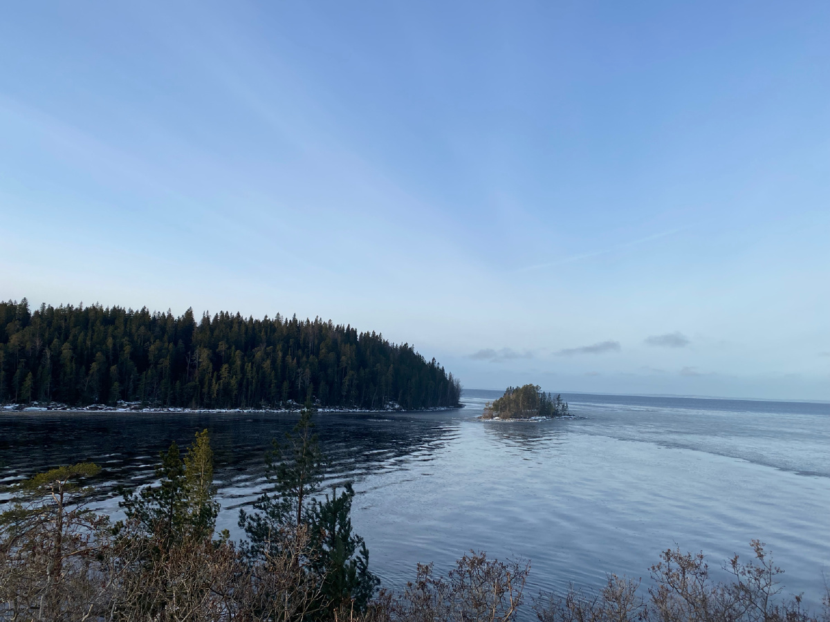 Редкий хвойный лес на скалах, со всех сторон, окруженных водой - это зрелище стоит поездки даже зимой.