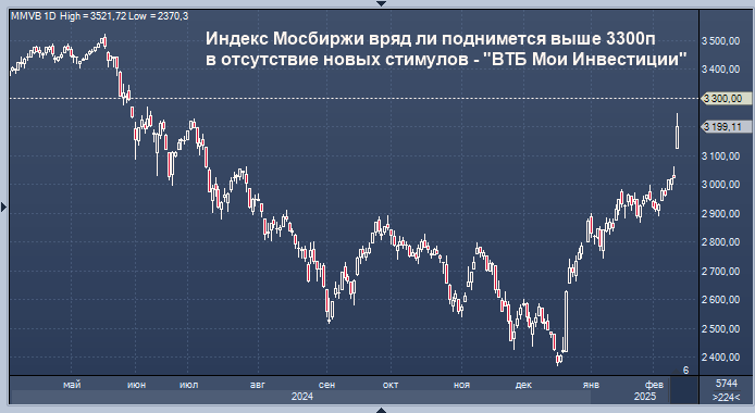 Индекс Мосбиржи вряд ли поднимется выше 3300п в отсутствие новых стимулов - "ВТБ Мои Инвестиции" График индекса Мосбиржи интервалами в 1 день Индекс Мосбиржи вряд ли поднимется выше 3300п в отсутствие новых стимулов, полагает инвестиционный стратег брокера "ВТБ Мои Инвестиции" Станислав Клещев. "Рынок стремительно вырос: +7% по индексу Мосбиржи, +4% по Индексу RGBI за два последних торговых дня. Российский рынок акций уже не выглядит дешевым, если сопоставлять с текущими макропоказателями. Однако заметное укрепление рубля вкупе с 20%+ ставками могут препятствовать дальнейшему росту капитализации рынка. В отсутствие новых стимулов индекс Мосбиржи вряд ли поднимется выше 3300 пунктов", - пишет эксперт в комментарии. На взгляд аналитика, Банк России может добавить оптимизма, хотя последний принт недельной инфляции разочаровал, а устойчивость замедления в кредитовании ещё должна быть подтверждена. "Другим топливом для дальнейшего роста индекса может стать ослабление рубля, - считает Клещев