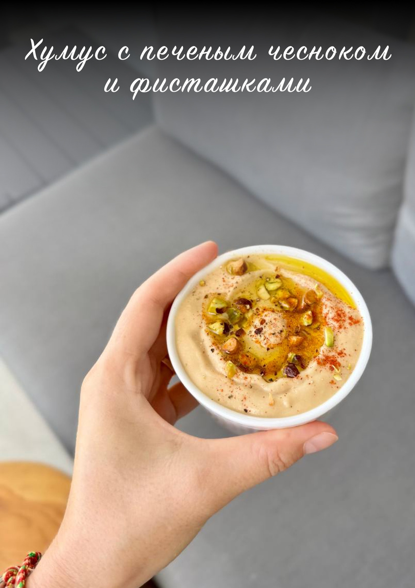 Этот хумус свел меня с ума 🤤 Кстати, в моем канале телеграмм больше разных рецептов, а так же нутри-статей о здоровье. Подписывайся Чеснок - 1 головка Нут консервированный - 0,5 упаковки Сок 1/2 дольки лимона Тахини - 1-2 ст.л Оливковое масло Фисташки Соль, перец Первым делом ставим запекаться чеснок. Берём головку чеснока, очищать не нужно, немного срезаем верхушку, сбрызгиваем маслом, заворачиваем в пергамент и убираем в духовку на 180 градусов на 50-60 мин. Далее, как только чеснок приготовился, смешиваем в блендере чеснок, нут, тахини, сок лимона и специи. Далее выкладываем в формочку, поливаем сверху оливковым маслом и посыпаем орешками. Ум отъесть, как вкусно! Подавала его с пряными морковными вафлями, рецепт будет в следующем посте