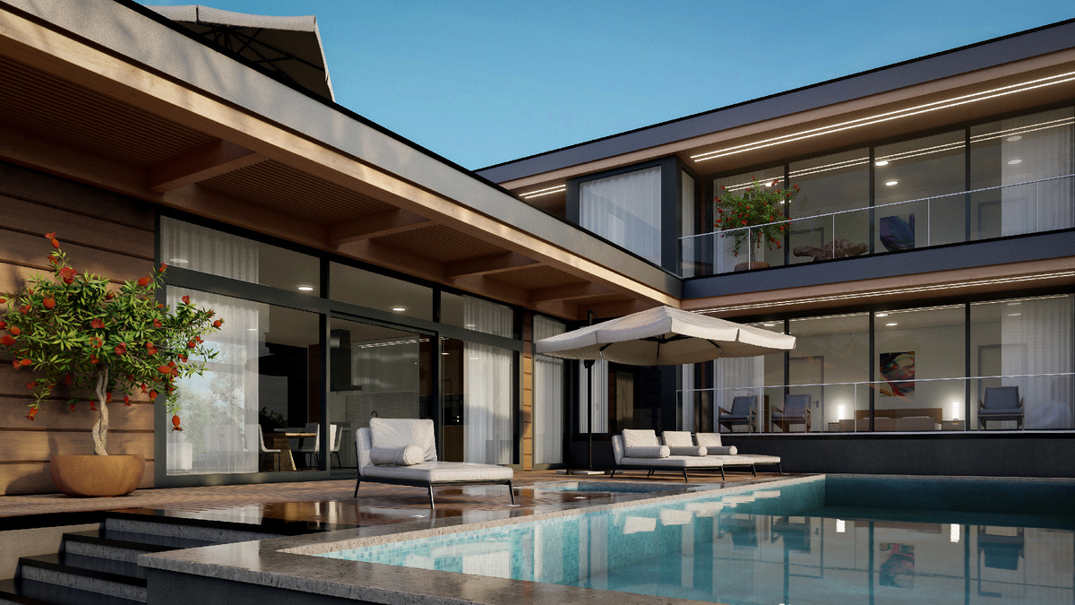 Открытый бассейн придает внешнему участку резиденции истинный шик. Он органично вписан в ландшафтную архитектуру и окружен просторной террасой с шезлонгами, где можно наслаждаться солнечными днями и вечеринками под открытым небом. Простор вокруг открытого бассейна также идеально подходит для установки зоны барбекю или организации отдыха для гостей в тени уютных пергол. Наличие двух бассейнов подчеркивает статус и универсальность резиденции, предлагая как активные, так и расслабляющие форматы досуга на любой вкус.