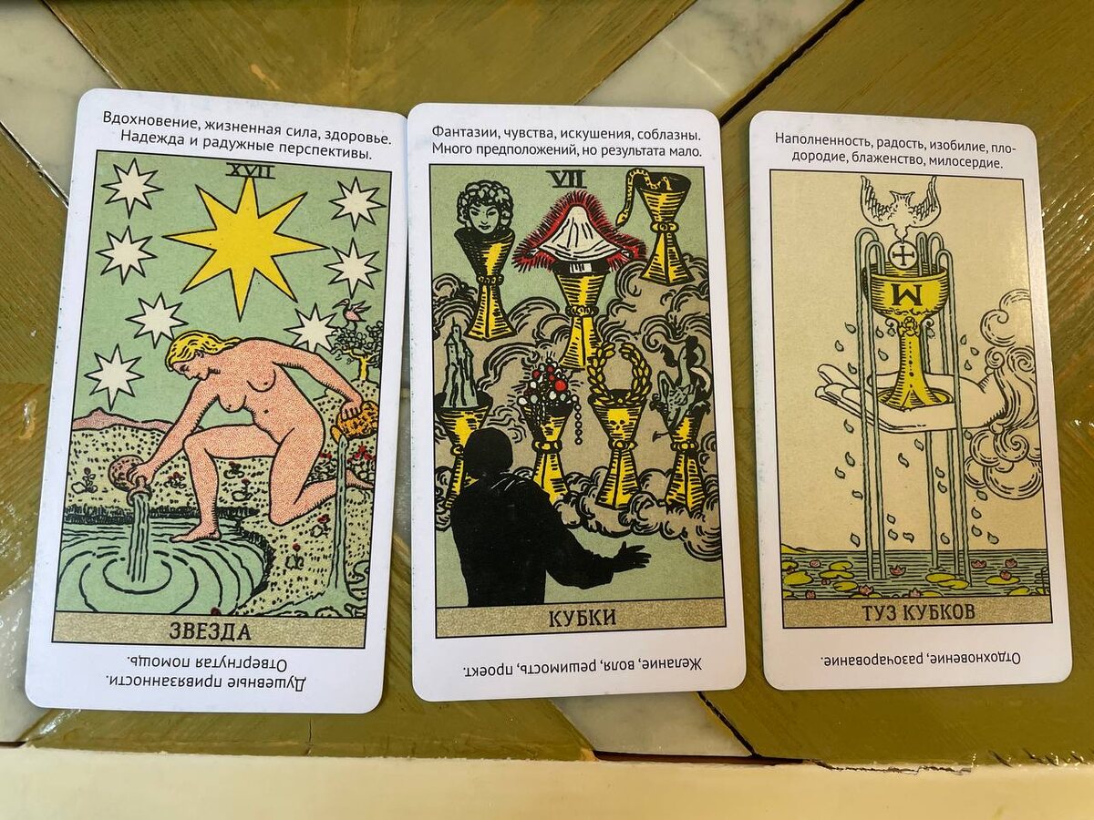 Читаем триплет: ЧТО ПРОИСХОДИТ В ЛИЧНОЙ ЖИЗНИ У МОЛОДОГО ЧЕЛОВЕКА? Краткая история такая: Начинаем с учениками изучать арканы таро, смотреть карту дня. Любопытство берет верх и уже хочется посмотреть не 1 карту дня, а получить больше информации особенно о бывшем. Что у него там с личным? Ок. Выкладываем триплет. А как прочитать? Даю краткую инструкци чтения триплета: ✅️1. Мы видим доминирующую масть Кубки- стихия вода, сфера чувств, эмоций. Цифры 7( внутренний кризис) и 1 ( начало импульс) Мы ещё триплеты не разбирали, но обязательно сделаем это. А сейчас мы забежим вперёд и обратим внимание на последовательность - от старшего аркана Звезды двигаемся в 7, а потом в 1. То есть обращаем внимание на движение цифр. ✅️2. Триплет читаем слева на право , где левая карта предыстория, недавнее прошлое, средняя- настоящий момент, а правая- грядущее. Так же мы можем прочитать триплет как проблема- решение- результат. Или все три карты прочитать как структуру предложения с существит