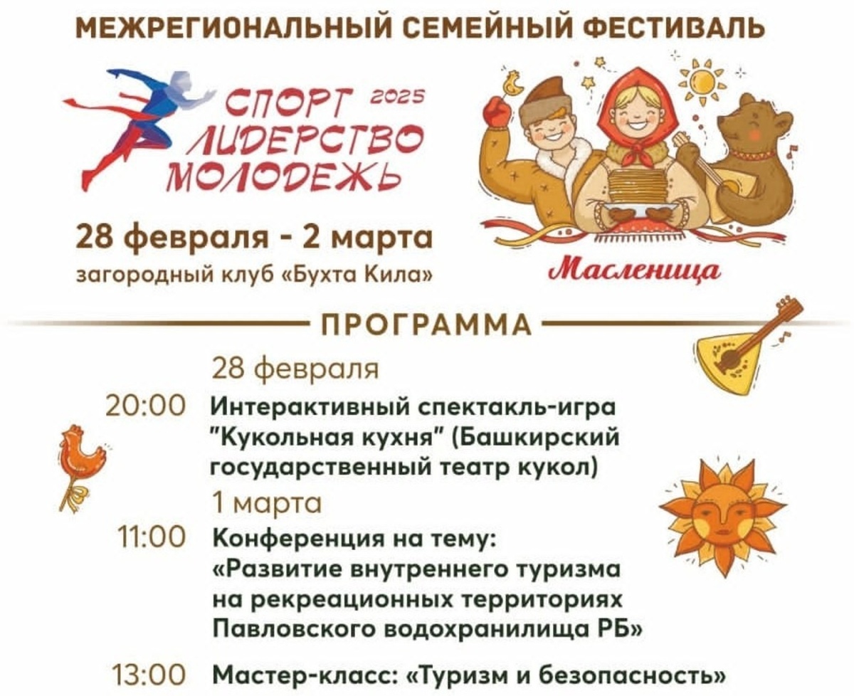В программе фестиваля — традиционные проводы зимы «Масленица», интерактивный кукольный спектакль, веселые старты и подвижные игры на свежем воздухе. Одним из ключевых событий фестиваля станет конференция «Развитие внутреннего туризма на рекреационных территориях Павловского водохранилища Республики Башкортостан». В ней примут участие ведущие туроператоры, отельеры и представители ресторанного бизнеса. Они обсудят с экспертами и представителями госструктур перспективы развития туриндустрии. Фестиваль «Спорт. Лидерство. Молодежь» объединяет усилия государства, бизнеса и общества для развития семейного туризма и активного молодежного отдыха в Башкортостане, отметила министр предпринимательства и туризма РБ Зухра Гордиенко. По ее словам, республика стремится стать лидером в этой сфере, привлекая все больше туристов и обеспечивая устойчивый экономический рост за счет развития туристической инфраструктуры. Фото организаторов фестиваля