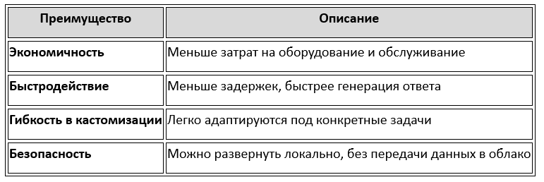 ✔️ Малые модели выигрывают в скорости, экономичности и гибкости.