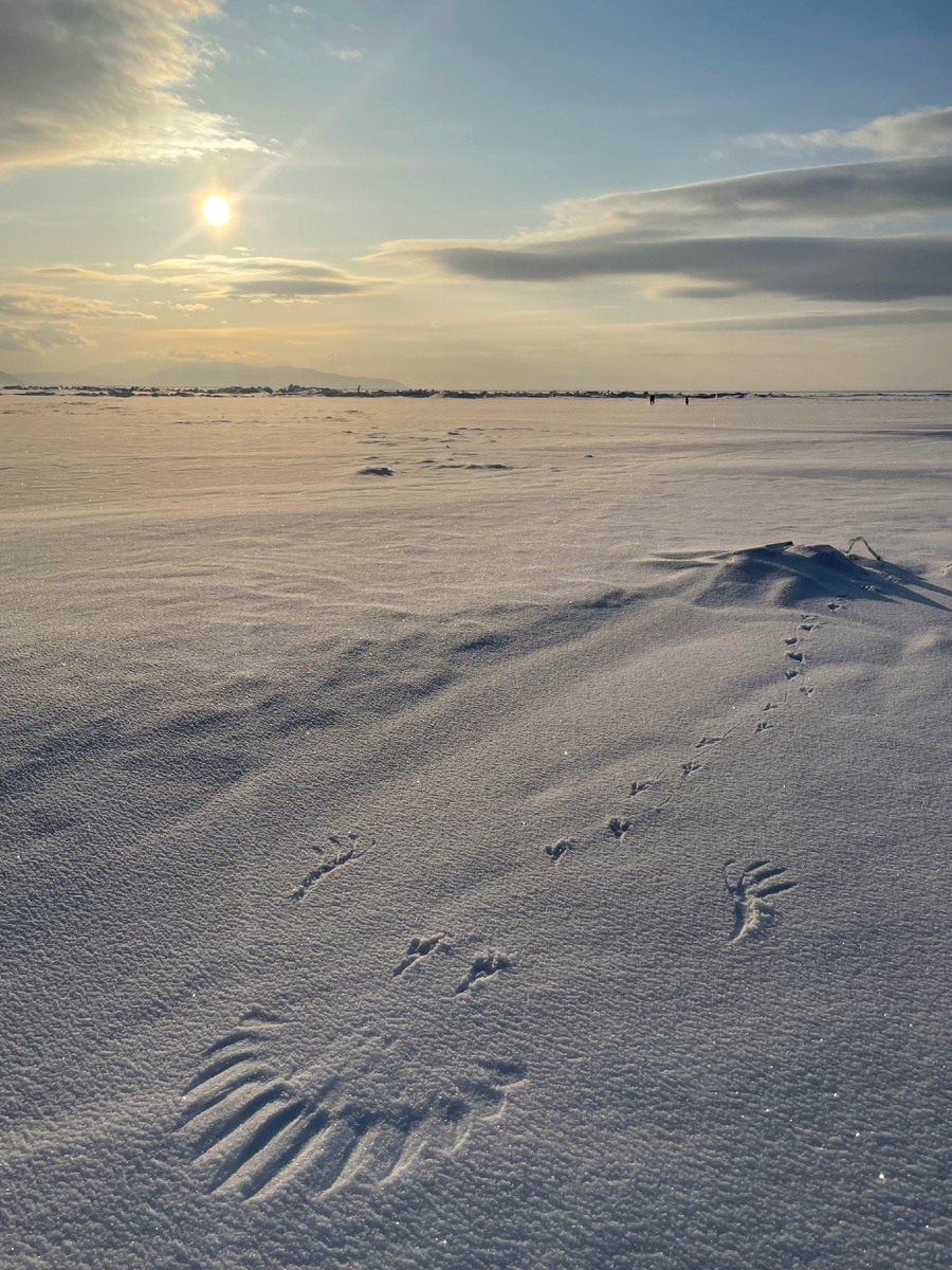 Что привлекло её на белом покрывале Байкала? Может, как и нас, красивый февральский закат…