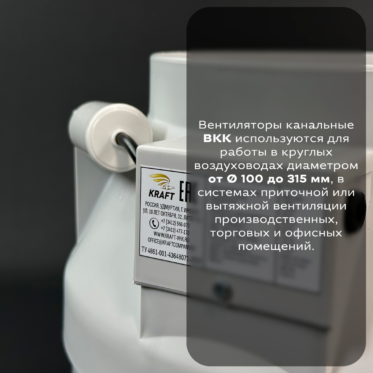 Компания КРАФТ занимается производством круглых канальных вентиляторов ВКК, которые широко используются в системах вентиляции и вытяжки. Наши вентиляторы собираются в России с использованием мотор-колес от проверенных производителей из Китая, Германии и Швейцарии. Мы производим несколько линеек канальных вентиляторов - V, M и E. Серия V : корпус выполнен из прочного промышленного ABS-пластика, мотор колеса производства Китай. Cерия М : корпус выполнен из металла, мотор колеса производства Китай Cерия Е : корпус выполнен из прочного промышленного ABS-пластика, мотор-колеса Германия и Швейцария. В этой статье более подробно рассмотрим вентиляторы ВКК V. Данные вентиляторы представлены в шести диаметрах 100, 125, 160, 200, 250 и 315 мм. Корпус вентилятора выполнен из промышленного ABS-пластика, который выдерживает температуру от -40°С до +120°С. Вентилятор в корпусе из ABS-пластика имеет меньший вес, что в большинстве случаев позволяет устанавливать его без кронштейна путем крепления непо