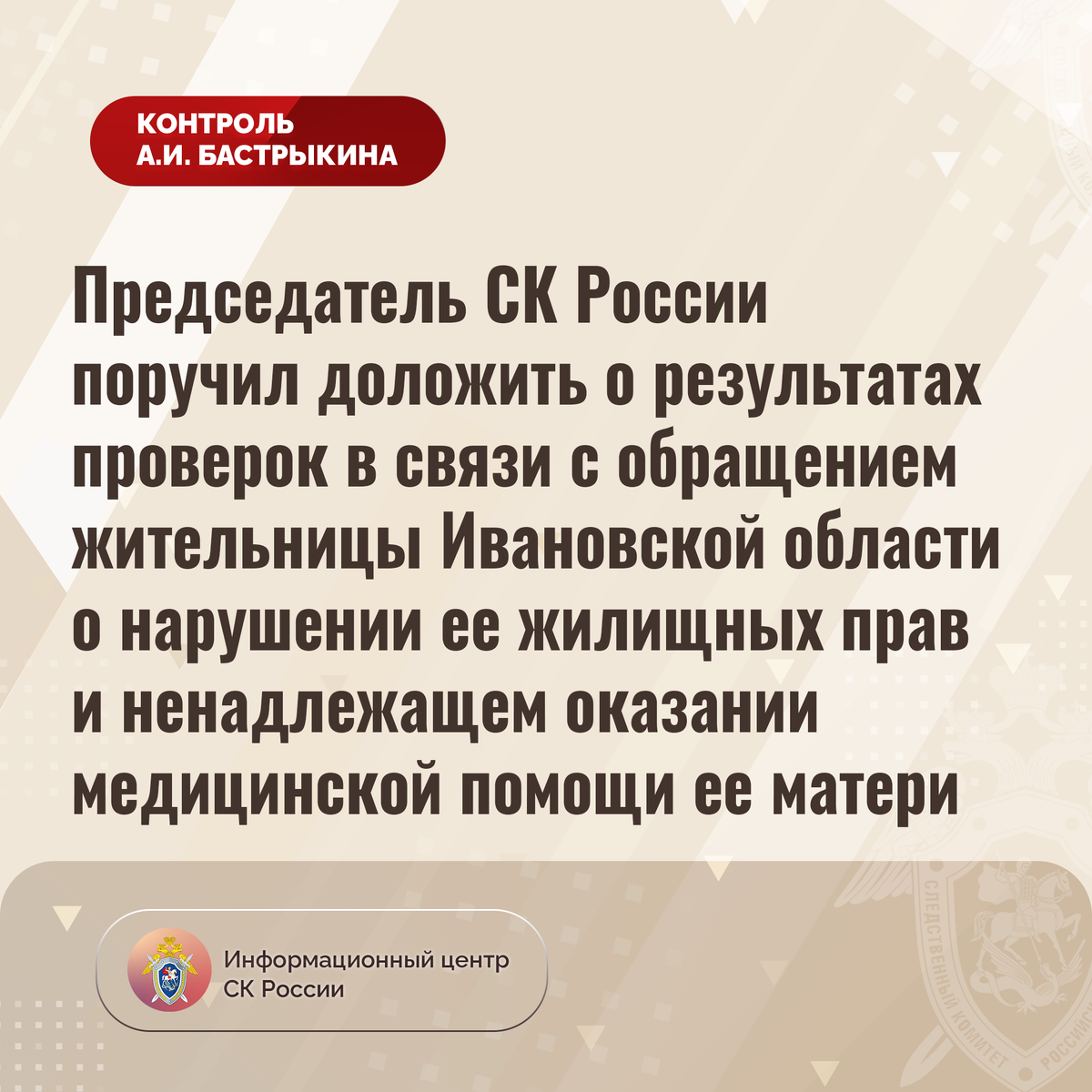 Председатель СК России поручил доложить о результатах проверок в связи с обращением жительницы Ивановской области о нарушении ее прав