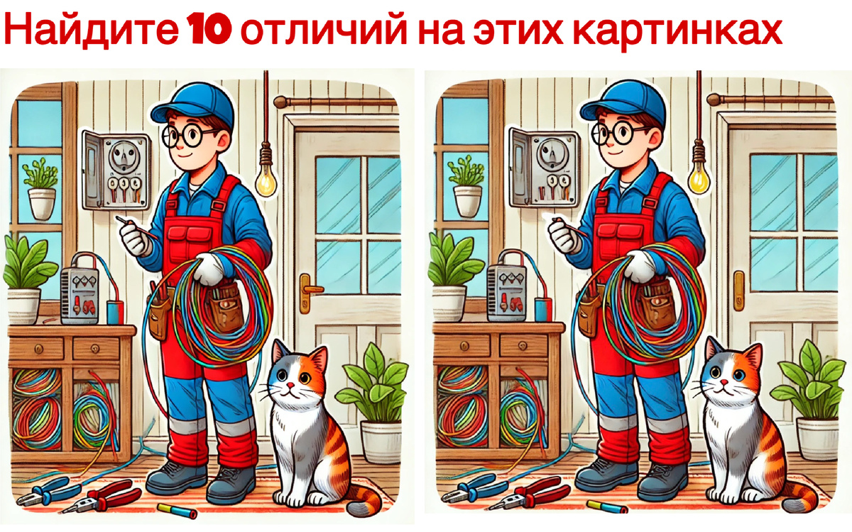 На картинке изображен электрик, который занимается работой в помещении. Но если приглядеться, то можно найти некоторые изменения. Сможете найти все 10 отличий за 30 секунд?