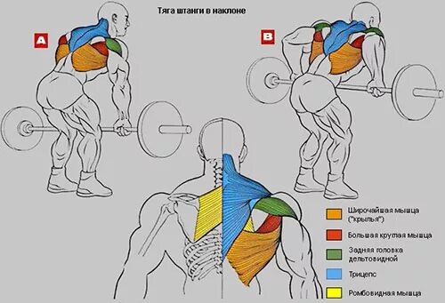 Как жим с груди лежа на скамье — король упражнений для мышц груди, так и тяга штанги к поясу (тяга в наклоне) — лучшее из упражнений для широчайших мышц спины и трапеций. Большинство других упражнений на широчайшие не позволяют бороться напрямую с силой земного притяжения — использование блоков снижает нагрузку в упражнениях с использование тросов. И только тяга штанги позволяет нагрузить мышцы, что делает это упражнение просто незаменимым при работе над спиной. Если рассматривать это упражнение с силовой точки зрения, то оно является основой большинства лучших атлетических программ. И когда приходит время работать над размерами, нет такого тяжелоатлета, который бы исключил это упражнение их своей программы тренировки. Как делать: Возьмитесь за гриф хватом «ладони вниз», стопы устойчиво стоят на полу на ширине плеч, ноги согнуты в коленях под углом 15 градусов. В согнутом положении корпус не должен быть параллелен полу, угол между корпусом и полом должен составлять 60 градусов. Есл