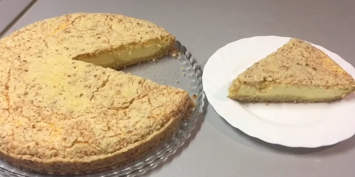Ватрушка по-королевски — это нежный и воздушный вариант классической ватрушки, похожий на творожный пирог или запеканку. Готовится без дрожжевого теста, а благодаря рассыпчатой основе и ароматной начинке получается невероятно вкусной. -Мука — 2 стакана (примерно 260 г) -Сливочное масло (холодное) — 150 г -Сахар — 100 г -Разрыхлитель — 1 ч. л. -Творог — 500 г -Яйца — 3 шт. -Сахар — 150 г -Ванильный сахар — 1 ч. л. -Сметана — 2 ст. л. -Крахмал (или манка) — 1 ст. л. 1. В глубокой миске смешайте муку, сахар и разрыхлитель. Добавьте холодное сливочное масло, нарезанное кубиками, и перетрите всё в крошку руками или с помощью блендера. 2. В отдельной миске взбейте яйца с сахаром и ванильным сахаром. Добавьте творог, сметану и крахмал, тщательно перемешайте до однородности. Можно использовать блендер, чтобы масса стала более гладкой. 3. Форму для выпечки (диаметром 22–24 см) смажьте маслом. Выложите половину песочной крошки, равномерно распределяя по дну. Затем залейте творожную нач