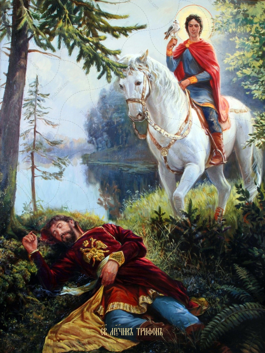 Здравствуйте, дорогие мои читатели! Сегодня я хочу поведать вам одно предание, сохранившееся со времён царствования Ивана Грозного. Рассказывает оно, как во время царской охоты улетел любимый царём кречет. Царь приказал своему сокольнику по имени Трифон Патрикеев найти улетевшую птицу. Сокольник Трифон объехал окрестные леса, но безуспешно. И вот на третий день, утомлённый долгими поисками, он остановился под Москвой, в месте, которое сейчас называется Марьина Роща. В изнеможении прилёг он отдохнуть, усердно помолившись перед этим своему святому покровителю, мученику Трифону, прося его о помощи. И вот во сне он увидел прекрасного юношу на белом коне, а на руке его царский кречет. — Я мученик Трифон, которого ты призывал на помощь, — сказал всадник. — Возьми свою птицу и поезжай с Богом к царю. И не печалься. Очнулся боярин ото сна и глазам своим не поверил: неподалёку на сосне сидит любимый царский кречет. Схватил он птицу покрепче, отвёз к царю все, что с ним произошло. А на месте, гд
