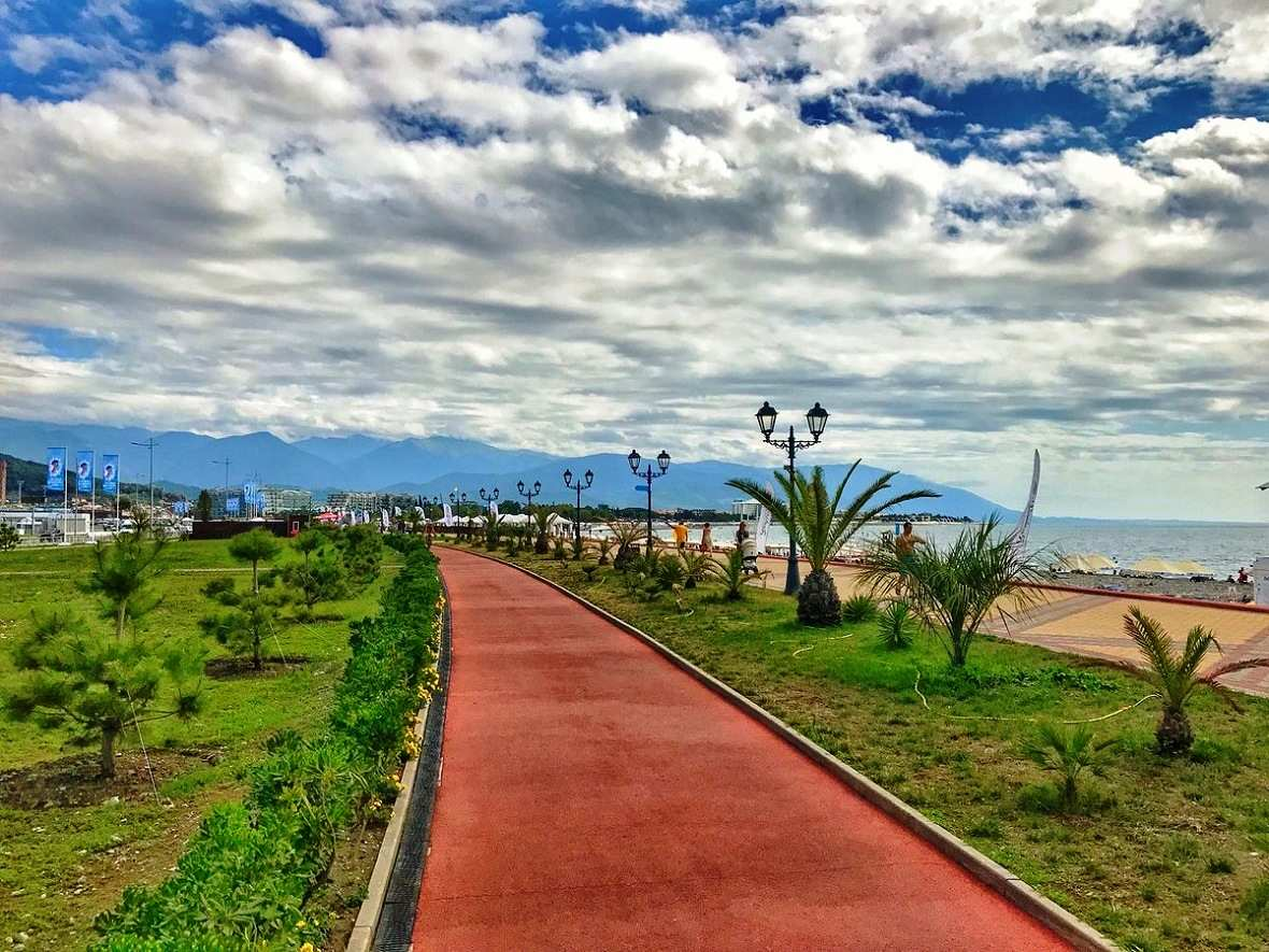 Первое, что поражает, — это простор. Набережная тут гораздо внушительнее, чем в Адлере или в центре Сочи. Широкие дорожки для прогулок, велодорожки, зоны для воркаута — всё это на фоне моря, олимпийских объектов и Кавказских гор.
