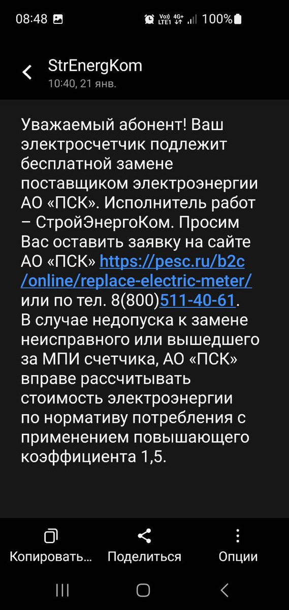 В прошлом году мы уже писали о схеме мошенничества, в рамках которой жулики звонят от имени энергосбытовых организаций и предлагают поменять обычные счётчики на «умные», которые сами отправляют показания. В конце, конечно же, требуется сообщить пароль от «Госуслуг». Теперь же обнаружена новая схема, выглядящая гораздо более правдоподобно из-за своей продуманности и многоуровневости, впрочем, мошенники всё же «палятся» на мелочах, хотя большинство жертв вряд ли их заметит. Итак, начинается всё с того, что на телефон приходит SMS-сообщение с легитимного «буквенного» номера следующего содержания: «Уважаемый абонент! Ваш электросчетчик подлежит бесплатной замене поставщиков электроэнергии АО «ПСК». Исполнитель работ – СтройЭнергоКом. Просим вас оставить заявку на сайте АО «ПСК» – далее ссылка, или по тел. (номер). В случае недопуска к замене неисправного или вышедшего за МПИ счетчик, АО «ПСК» вправе рассчитывать стоимость электроэнергии по нормативу потребления с применением повышающего ко