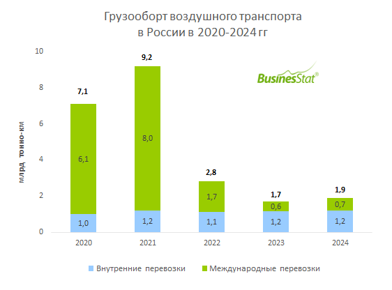 По данным "Анализа рынка грузовых авиаперевозок в России", подготовленного BusinesStat в 2025 г, в 2024 г грузооборот авиатранспорта в стране вырос на 11,4% и составил 1,9 млрд тонно-км. В 2022-2023 гг после введения санкционных ограничений рынок воздушных грузоперевозок в России фактически утратил большую часть международных транспортных маршрутов. До 2022 г на международные перевозки приходилось более 85% суммарного грузооборота российских авиаперевозчиков. Закрытие рынков недружественных стран для российских компаний, запрет на использование их летного пространства, сокращение парка грузовых воздушных судов, санкции в отношении крупных операторов рынка привели к падению грузооборота воздушного транспорта России с 9,2 млрд тонно-км в 2021 г до 1,7 млрд тонно-км в 2023 г. К 2024 г рынок стабилизировался на новом более низком уровне.В 2024 г российские авиаперевозчики смогли увеличить объемы доставки грузов, кроме того впервые за два года увеличилась средняя дальность авиаперевозок,
