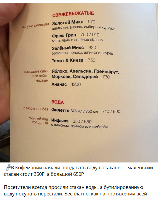 Сетевое кафе «Кофемания» начало продавать воду за 350 или 650 рублей в зависимости от объема. На это обратили внимание телеграм-каналы «Новости Москвы» и «ЛюбаЕСТ». По данным «Новостей Москвы», раньше в «Кофемании» наливали воду бесплатно. В меню, которое опубликовал канал «Новости Москвы», вода с названием «Инфьюз» продается за 350 или 650 рублей. Можно заказать горячую или холодную воду и выбрать добавку: лимон, лайм или имбирь. Бутилированная вода с газом и без в том же меню стоит 710 рублей за 375 миллилитров и 990 — за 750 миллилитров. Оба телеграм-канала пишут 350 рублей стоит маленький стакан воды, а 650 — большой. Канал «ЛюбаЕСТ» нашел пост посетительницы «Кофемании», которая, как она утверждает, поговорила с официантом о нововведении. По словам сотрудника, в кафе упали продажи бутилированной воды из-за того, что клиенты стали чаще брать бесплатную воду в стаканах. Автор поста добавила, что ей пришлось купить стакан воды за 350 рублей, чтобы запить таблетки. «Новости Москвы» пр