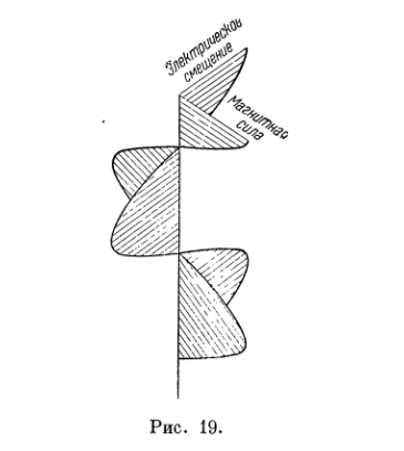 Двигаясь по страницам работ Максвелла, я набрел наконец на статью «Плоские волны» в "Трактате об электричестве и магнетизме" . Приведу цитату, которая объясняет, что плоскими волны стали, когда «Все физические величины, изменения которых приводят к образованию таких волн, являются функциями только z и t и не зависят от х и у.» То есть все изменения лежат в математической в плоскости, перпендикулярной оси z. В работах Максвелла обозначения переменных совсем не такие, как принято обозначать напряженности полей, токи и потоки сегодня. Поэтому я не буду приводить формулы из «Трактата об электричестве и магнетизме» параграф 790. Желающие могут сами прочитать этот трактат и сделать свои выводы. Покажу только рисунок 19. Здесь ось z – это вертикальная линия, а оси x и y не имеют значения. С каким же облегчением я прочитал слова «Электрическое смещение», которыми Максвелл обозначал аналог ТОКА в диэлектрике. Кто же будет спорить, что «Магнитная сила» или напряженность магнитного поля изменяет