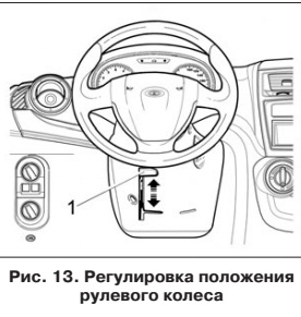 РЕГУЛИРОВКА ПОЛОЖЕНИЯ РУЛЕВОГО КОЛЕСА На автомобиле устанавливается регулируемая по углу наклона рулевая колонка. Для выбора оптимального положения рулевого колеса опустите блокирующую рукоятку 1 (рис. 13) вниз и, после установки рулевого колеса в желаемое положение, зафиксируйте рулевую колонку перемещением рукоятки в крайнее верхнее положение. Предупреждение Регулировку положения рулевой колонки проводите только на неподвижном автомобиле.