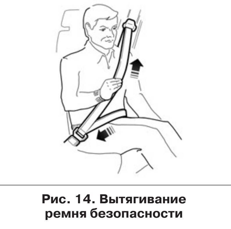 РЕМНИ БЕЗОПАСНОСТИ Ремни безопасности являются эффективным средством защиты водителя и пассажиров от тяжелых последствий дорожно-транспортного происшествия (ДТП). Чтобы пристегнуться ремнем, плавно вытяните его, взявшись за язычок ремня (рис. 14), и вставьте язычок 2 (рис. 15а) в замок 1 до щелчка, не допуская при этом скручивания лент. Убедитесь, что нижняя лента ремня плотно прилегает к бедрам. Не допускается, чтобы нижняя лента ремня проходила вокруг талии или под бедрами. Для отстегивания ремня нажмите на красную кнопку замка, ремень автоматически будет втягиваться в катушку. Если втягивание ленты идет недостаточно эффективно, то держа язычок 2 в руке, найдите положение ленты, при котором она полностью возвратится в катушку. ВНИМАНИЕ! Запрещается выходить из машины, не убедившись, что ремень полностью вернулся в исходное положение во избежание выноса ленты вместе с собой из автомобиля и повреждения ее при закрытии дверей автомобиля. Ремень в таком случае может оказаться непригодны