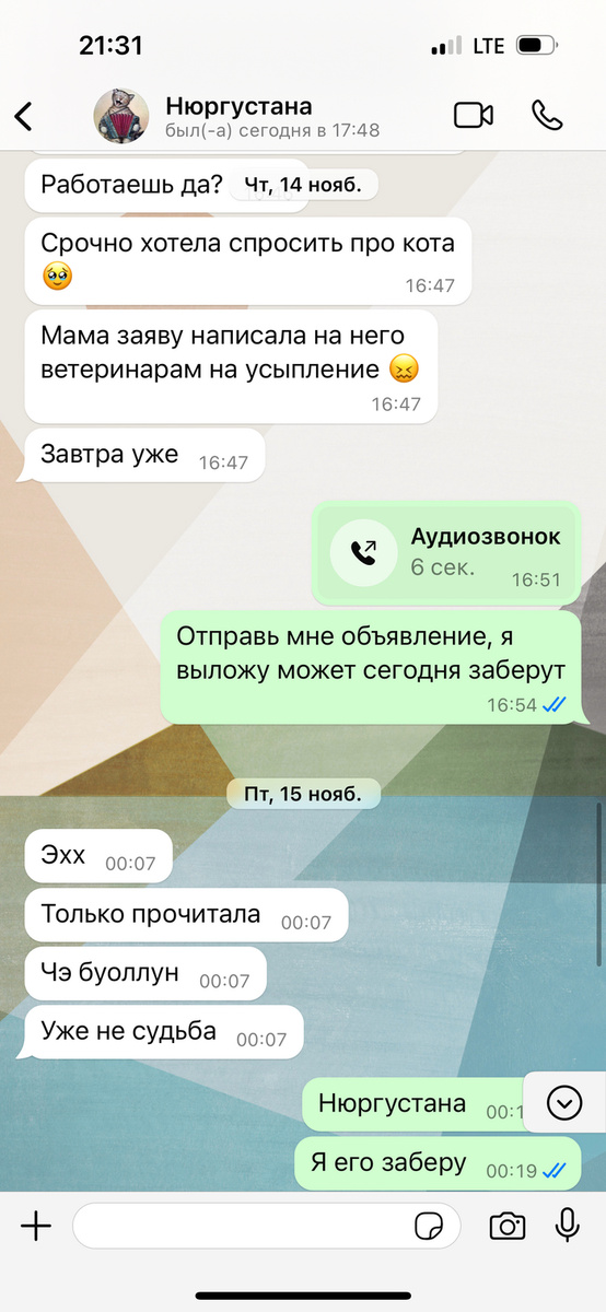 Осенью коллега попросила сделать репост объявления, чтоб забрали ее кота, из-за того, что у них не стерилизованная кошка родила, а ее мама разозлилась, что полный дом котов и грозилась отнести на усыпление. За год до этого кошка тоже родила. Тех котят раздали, а этого оставили с надеждой отдать, когда вырастет. Как выяснилось, взрослых котов никто брать не хочет. Эти объявления постились какое-то время, пока мать не написала заявление в ветеринарку. На следующий день Косю должны были усыпить. Коллега звонила мне, прося его забрать. Но я думала, как я с котом буду, за ним же надо ухаживать, заботиться, а вдруг он умрет; и отказала. Весь вечер потом ходила и думала, думала… Что могу спасти животное от смерти. Что если не заберу, потом никогда себе не прощу. Так было плохо, что горло сжималось. И я решилась: Больше всего было страшно, что она не успеет прочитать, а утром его уже увезут. Но она тоже не спала допоздна) И на следующий вечер, после тяжелого дня, в котором я узнала, что у моей