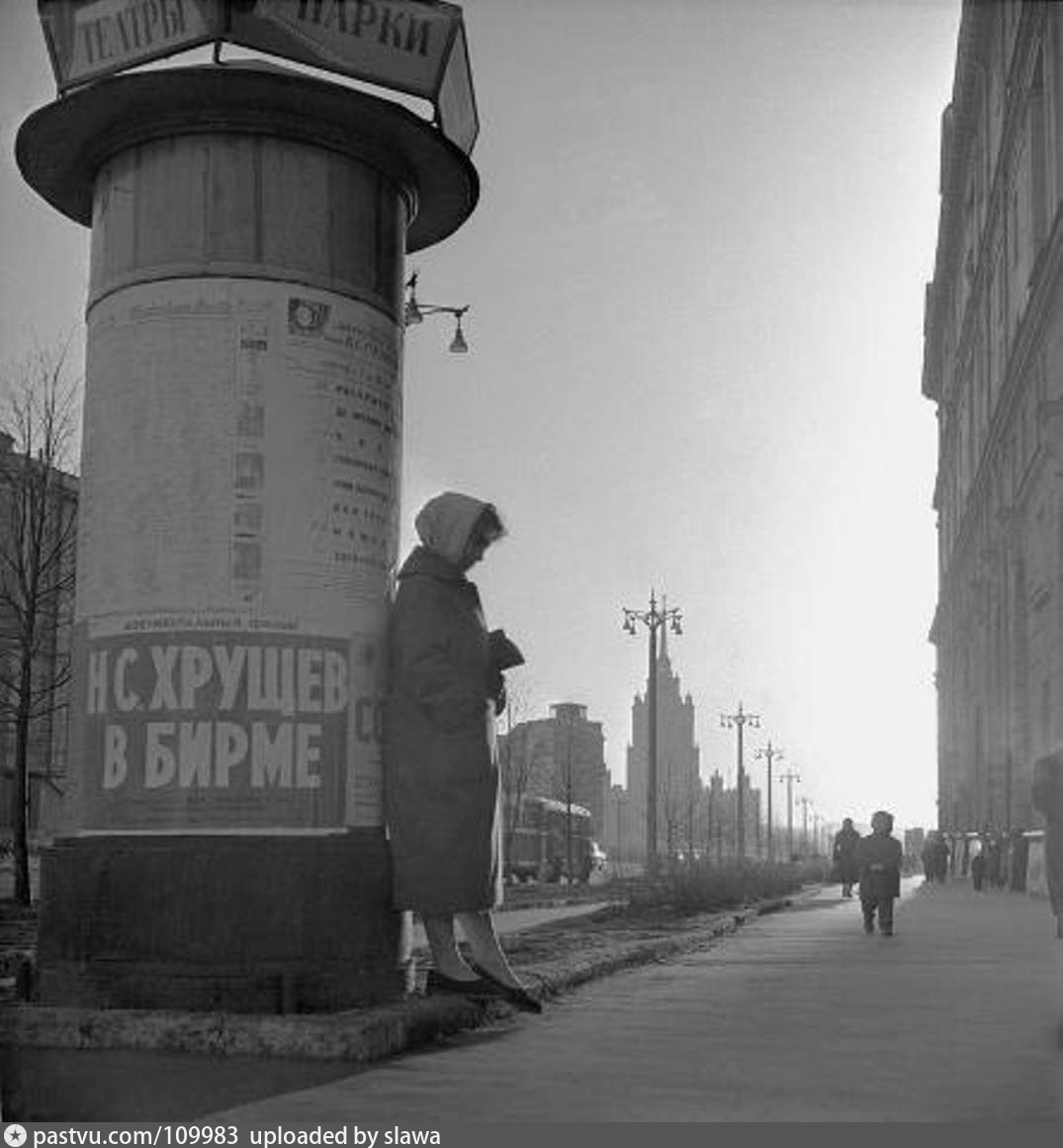 Давайте совершим очередное путешествие сквозь время, прогуляемся по улицам родного города, посмотрим, какой была жизнь в те годы и что изменилось за прошедшие десятилетия. Поехали! ... На фото нынешний участок улицы Новый Арбат от Садового кольца до Новоарбатского моста, перекинутого через Москву-реку. На переднем плане девушка, видимо, в ожидании молодого человека, стоит прислонившись к типовой афише тех лет. В том году вышел документальный фильм о посещении Никитой Сергеевичем Хрущевым Бирмы. На заднем плане видно профиль сталинской высотки - гостиницы "Украина". Фото 1960 года, Леонид Лазарев Вид с этой точки сейчас. На переднем плане появился подземный переход через Новый Арбат и электронный рекламный стенд, а на заднем плане вырос лес небоскрёбов Москва-Сити А здесь запечатлены советские граждане идущие с лозунгами по проезжей части Садового кольца от Баррикадной улицы к посольству штатов. Требуют убрать руки от Кубы. Фото 1962 года, Юрий Сомов Несколько лет назад Садовое кольцо к