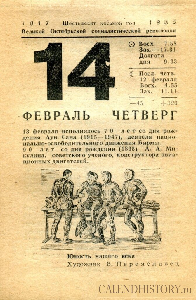Итак, сегодня 14-го февраля и у нас на календаре 1985-й год. Перед нами листок советского календаря для женщин. На календаре у нас четверг - 14 февраля 1985-го года. 13 февраля исполнилось 70 лет со дня рождения Аун Сана (1915-1947), деятеля национально-освободительного движения Бирмы. 90 лет со дня рождения (1895) А. А. Микулина, советского ученого, конструктора авиационных двигателей. Юность нашего века