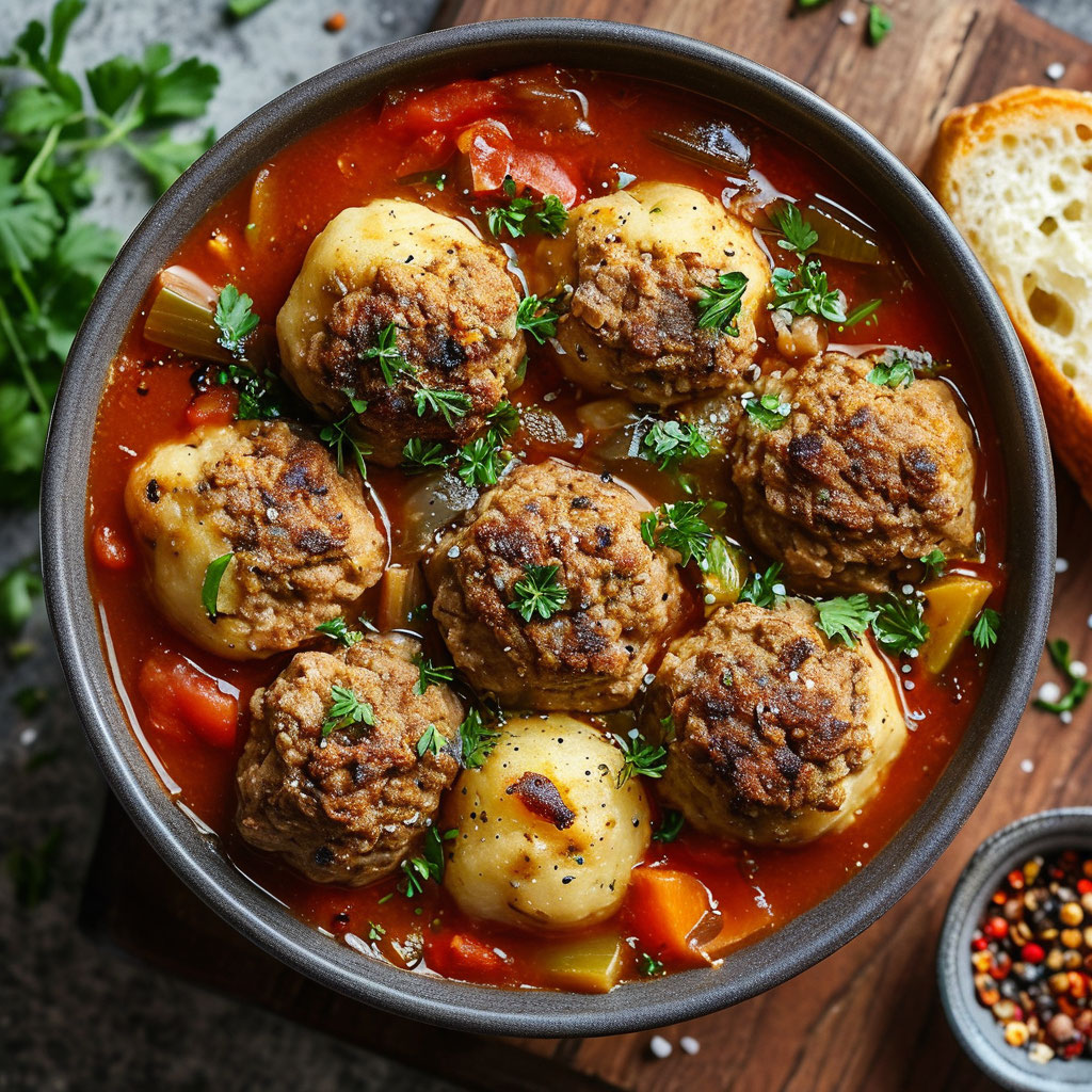 Этот суп сочетает нежные картофельные клёцки и сочные фрикадельки в ароматном бульоне.