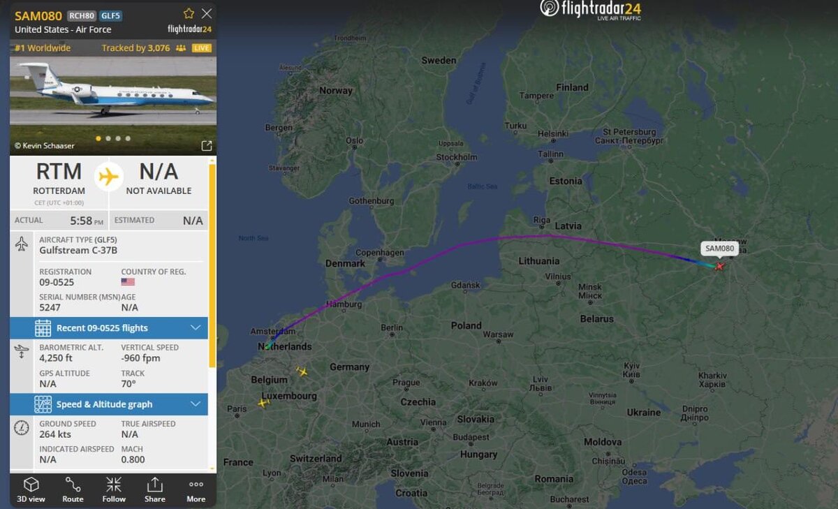 Самолет Gulfstream C-37B с бортовым номером 09-0525 совершил посадку в московском аэропорту Внуково сегодня вечером около 11 вечера по местному времени, следует из данных Flightradar24. Внимание на загадочный борт обратило издание «Агентство». Около полудня (по Москве) Gulfstream покинул военную авиабазу в штате Мэриленд, после чего сделал посадку в Нидерландах (Роттердам), откуда уже вылетел в столицу РФ. Кто именно находился на борту, неизвестно. OSINT-аналитик MenchOsint предположил, что в самолете прибыл высокопоставленный чиновник администрации президента США Дональда Трампа. ——— Скриншот: «Агентство» / Flightradar24.