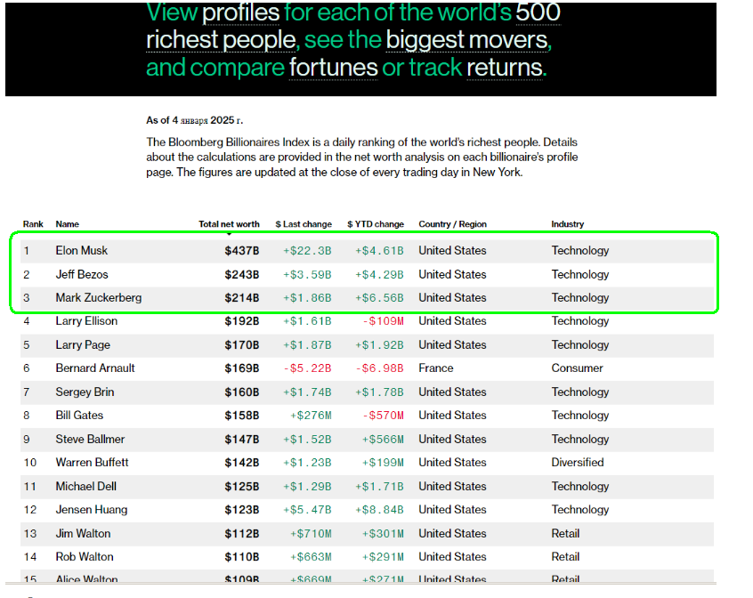 Илон Маск, Марк Цукерберг, Джефф Безос их всех объединяет то, что они миллиардеры, что кто-то из них изначально, а кто-то в последнюю минуту поддержали Трампа, и что они владельцы крупного IT-бизнеса.