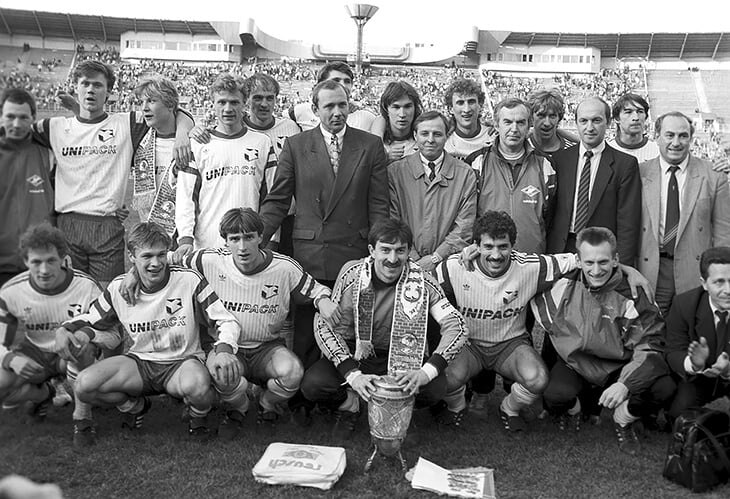 «Спартак»-1992: в центре Олег Романцев, справа от него Валерий Карпин, Владимир Бесчастных и Игорь Ледяхов, слева – Александр Тарханов. Станислав Черчесов с Кубком СНГ.