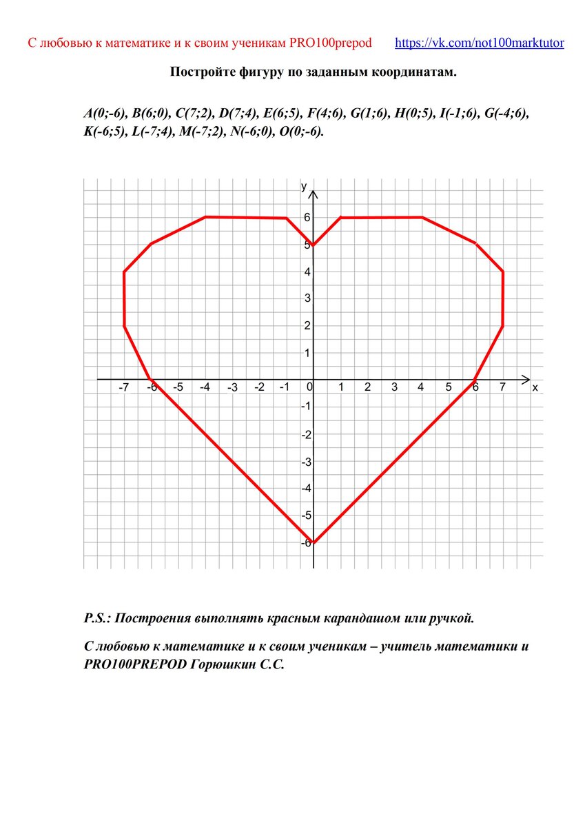 Всем доброе утро, мои любители математики! Поздравляю вас с днём всех влюблённых и днём влюблённых в МАТЕМАТИКУ. Математика навсегДА. Я искренне ценю поддержку каждого из вас! Благодарю каждого за вклад в развитие сообщества и желаю ВСЕМ кто не нашёл свою любовь и призвание - найти их в этом году. Мои коллеги, учителя, репетин.торы, мои прекрасные ученики и их родители - желаю искренни найти свою любовь, себя и любовь к своему делу и призванию. Вы молодцы! Внизу вас ждёт файл с валентинкой. Дарите любовь родным и близким и примете участие в ФЛЭШМОБЕ "ВАЛЕНТИНКА". Начертите её по координатам и прикрепите в комментариях. И мне и вам будет приятна любовь к нашему общему делу. С уважением, руководитель сообщества, ваш PRO100PREPOD С.С. Горюшкин