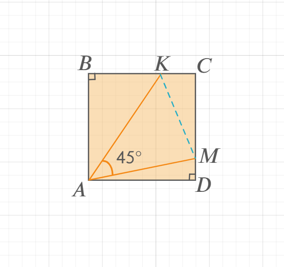 16. ★★☆ На сторонах BC и CD квадрата ABCD взяли точки K и M так, что угол MAK равен 45°. Докажите, что BK+DM=MK