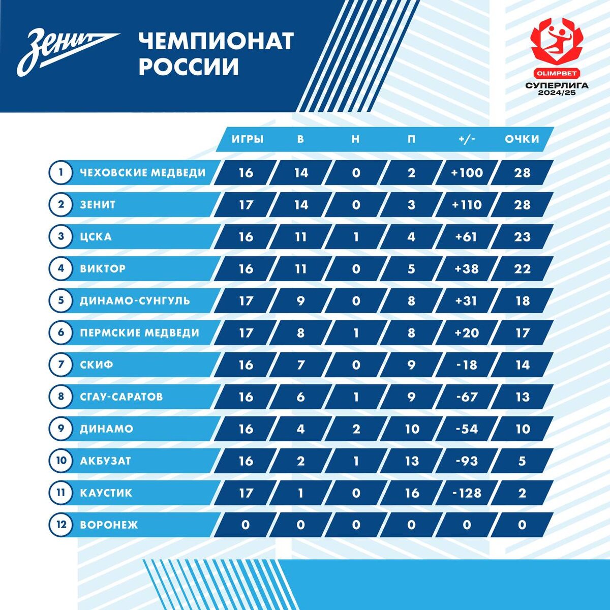 Конечно, мы хотим стать первыми, мы представляем «Зенит», от нас всегда требуется максимальный результат. При сложившейся ситуации в турнире мы будем стремиться побеждать соперников и выходить в лидеры.