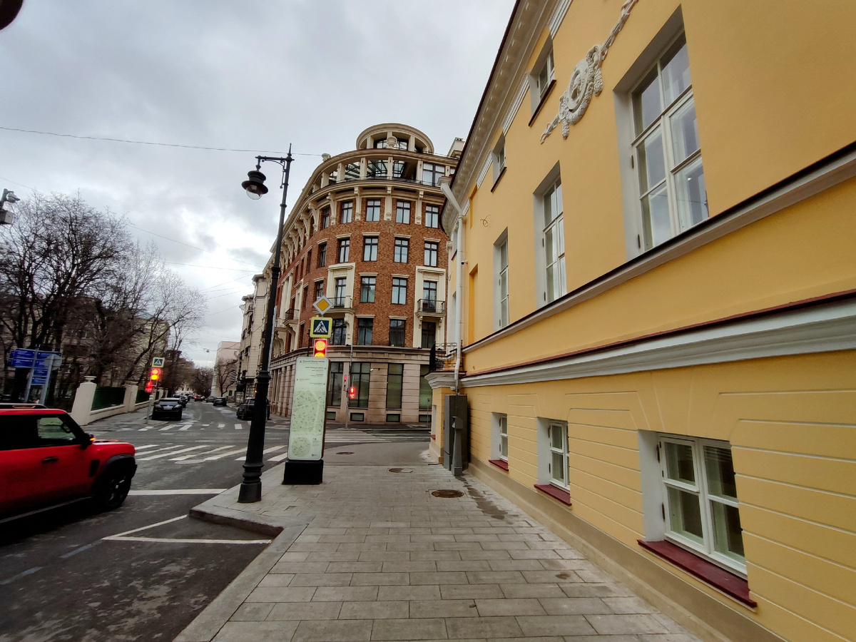 На углу Денежного переулка (д. 1/8) с Большим Левшинским переулком- старинное строгое трехэтажное здание.