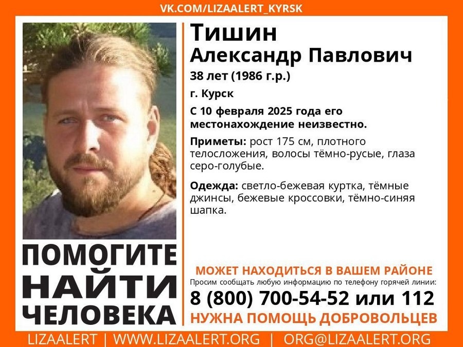Поисковый отряд «Лиза Алерт Курская область» распространил ориентировку на поиск исчезнувшего 38-летнего жителя областного центра. По данным волонтеров, пропал Тишин Александр Павлович. Его местонахождение неизвестно с 10 февраля. Требуется помощь добровольцев в поисках. Приметы: рост — 175 см, плотного телосложения, волосы тёмно-русые, глаза серо-голубые. Одежда: светло-бежевая куртка, тёмные джинсы, бежевые кроссовки, тёмно-синяя шапка. Всех, кто может располагать информацией о пропавшем курянине, просят сообщить об этом по телефонам 8-800-700-54-52 или 112. Сергей Яшин, по материалам https://vk.com/lizaalert_kyrsk Постоянный адрес новости на сайте «Друг для друга» ~ https://dddkursk.ru/lenta/2025/02/14/116246/. Новости Курска за ~ 14 февраля ~ февраль 2025 года.